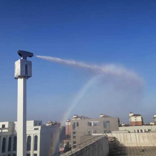 霧炮又稱霧炮機、噴霧炮,根據(jù)風(fēng)送原理,先使用進口高壓泵以及微細霧化噴嘴將水霧化,再利用風(fēng)機風(fēng)量和風(fēng)壓將霧化后的水霧送到較遠的距離,使得水霧到達較遠距離同時能夠覆蓋更大面積,水霧與粉塵凝結(jié)后降落,從而達到降塵目的。
