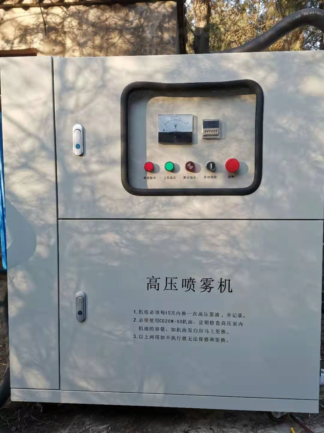 霧樁通過水泵動力源的驅(qū)動作用,通過主機將水加壓至高壓,再通過高壓噴嘴進行霧化和噴射,霧化顆粒在100um到150um之間,噴灑到半徑可達8-15米,有效解決了戶外除塵常常因為風(fēng)力降低噴霧除塵效果的問題,提高了噴霧效果和資源利用效率。
