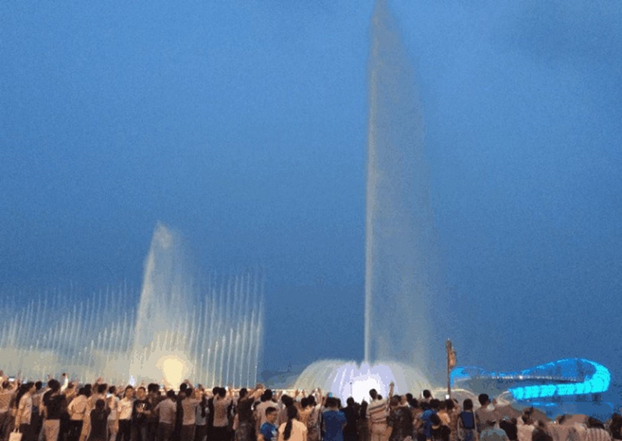 蘇州灣音樂(lè)噴泉,位于蘇州灣閱湖臺(tái)和8字回望景觀橋之間,南北總長(zhǎng)350米左右,由湖上噴泉、激光電影區(qū)和慶典噴泉三大組團(tuán)組成,共有噴頭1353個(gè),主噴頭的噴射高度將達(dá)到120米左右。